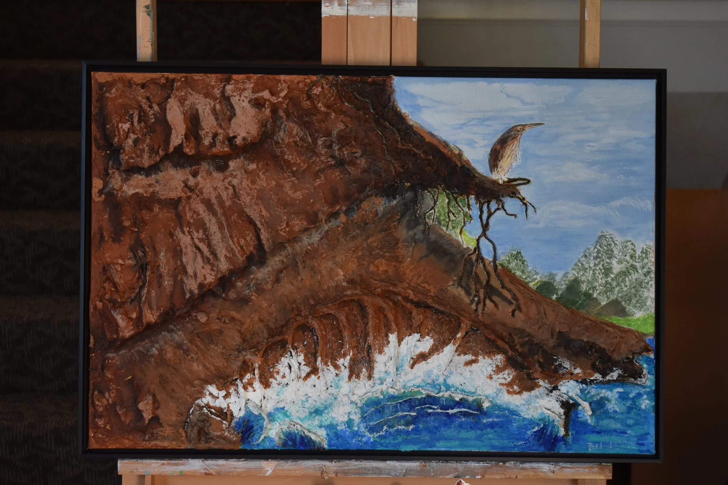 Pursuing this path was a fun and adventurous road for me. I was able to combine two areas of art that are dear to me. I found that adding materials found in nature to paint can also be as freeing as working with pulp. Applying the pulp itself to a canvas allowed me to mix the two-dimensional with the three-dimensional. The greatest compliment I receive is when people want to touch my work to see if it really is 3D or 2D. I work with natural dyes and acrylics to try to achieve a more realistic approach. Some of my projects include textile materials as well. My hope is that the combination of materials will result in their own distinctive interpretation.